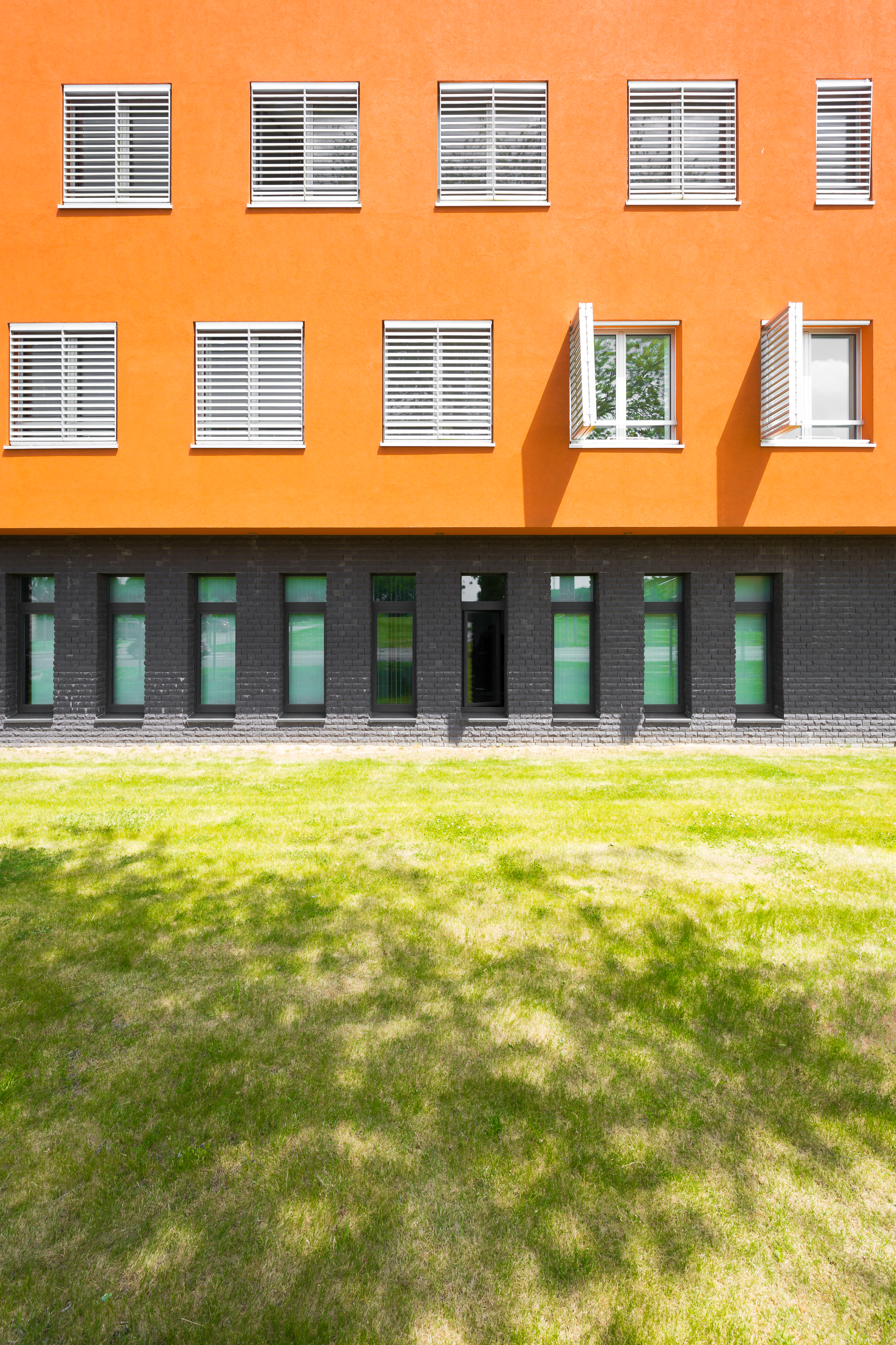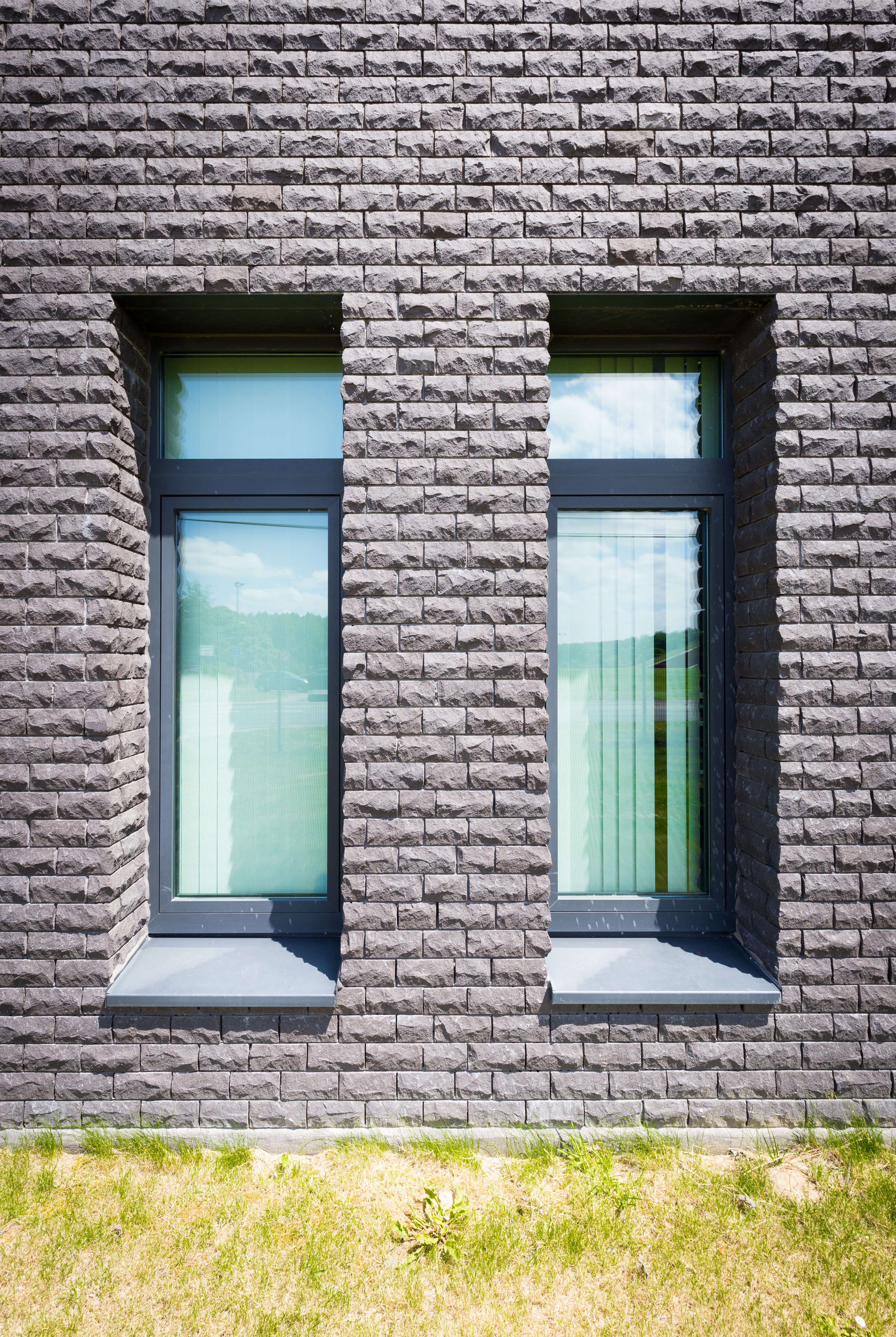 Le volume principal, lisse et coloré, s'appuie sur un socle sombre et rugueux apportant contraste et assise visuelle. Le bâtiment fait écho à la caserne des pompiers située en face et propose les mêmes textures et coloris mais dans un rapport inversé.